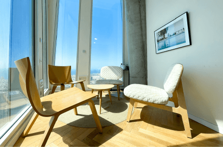 חדר ישיבות אלגנטי מול נוף עוצר נשימה. מתאים לישיבות של עד 5 משתתפים סביב שולחן עגול.