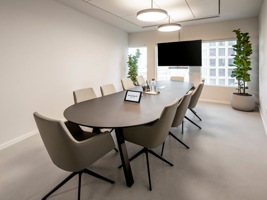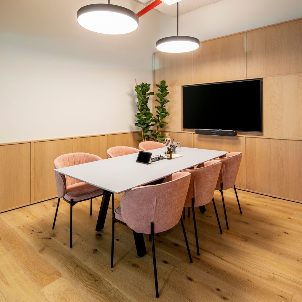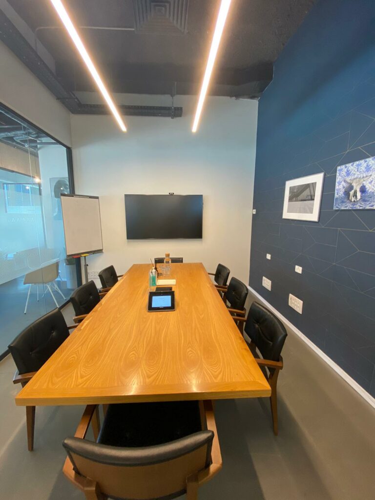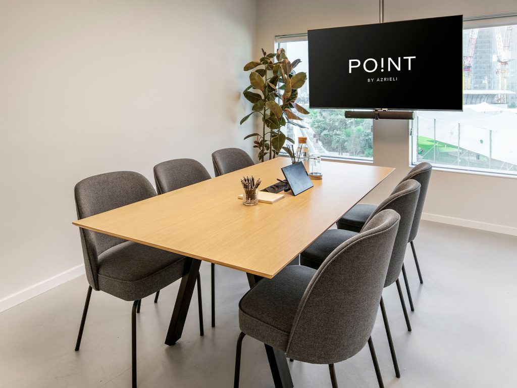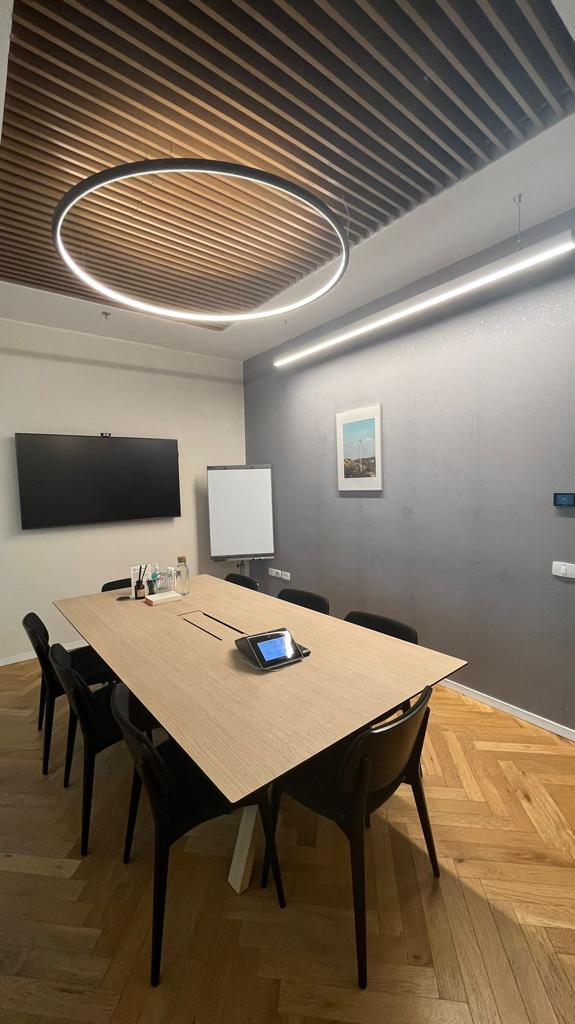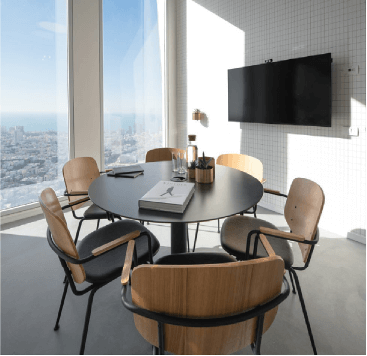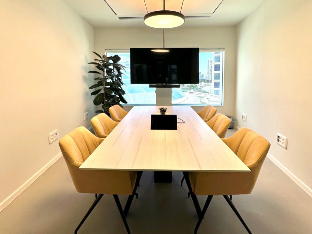 חדר ישיבות מואר ומעוצב, לפגישות עד 8 משתתפים. בחדר ישיבות עם מערכת זום חכם ומערכת מולטימדיה מתקדמת לפגישות און ליין.