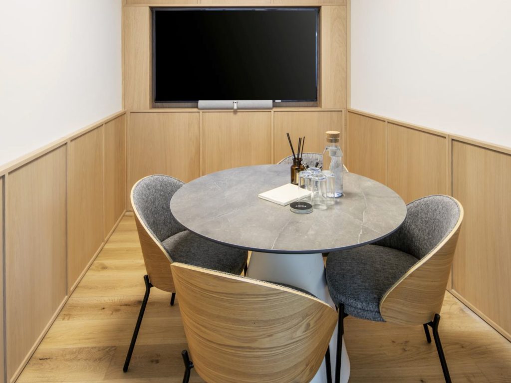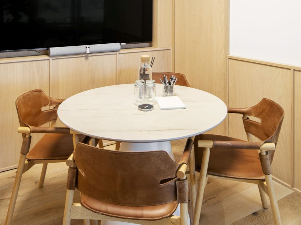 חדר ישיבות אינטימי ומעוצב לפגישות עד 4 משתתפים סביב שולחן עגול.